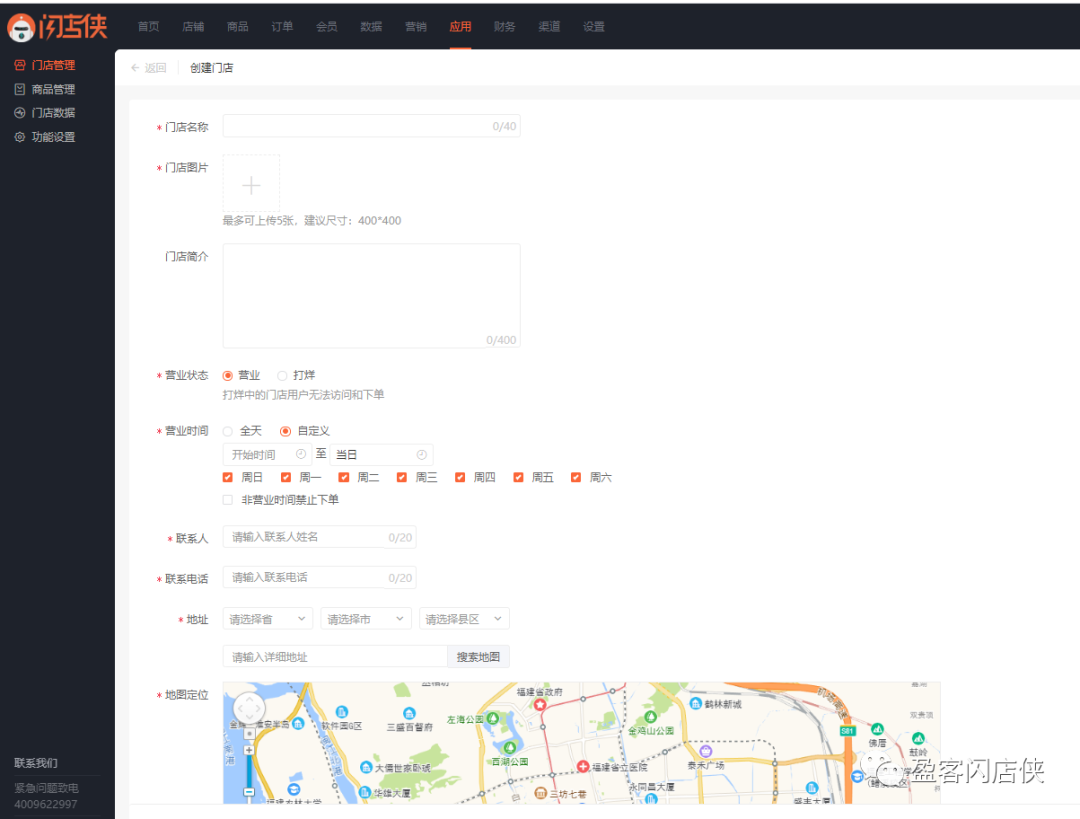 在业务端快速创建门店,包括:门店名称/图片、营业状态/时间、地址、地图定位、配送方式、可见范围等方面的设置;