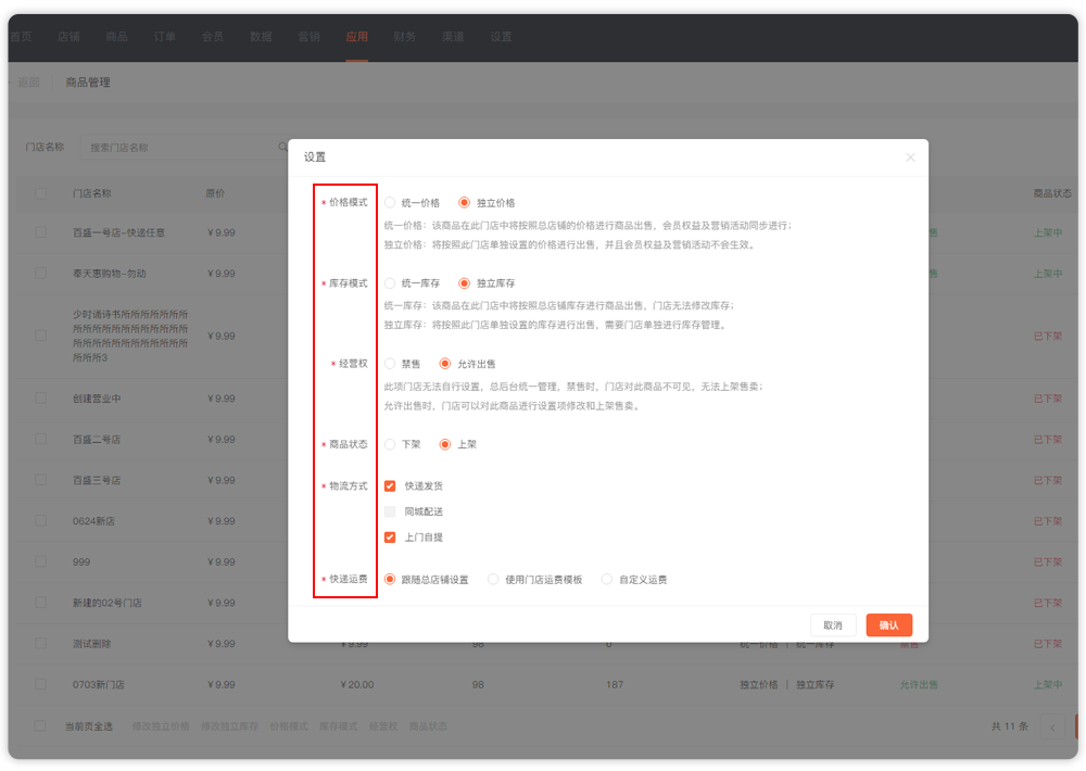 ▲总店铺可选择是否对门店开启独立价格/库存的设置权限;